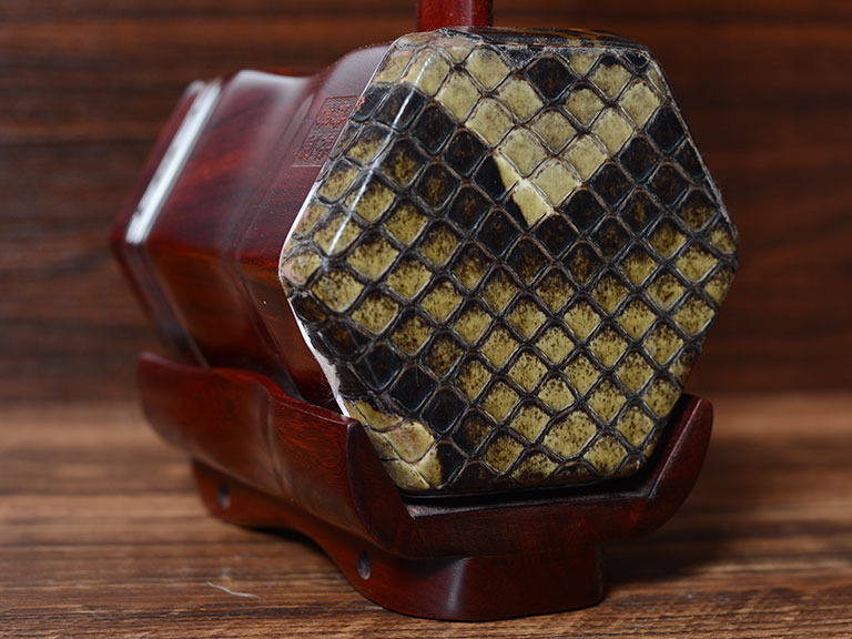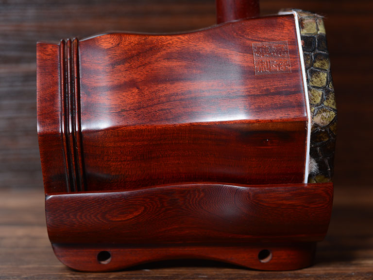 产品介绍 龙韵藏品级紫檀二胡选用上等紫檀木料、野生金花蟒皮佐以独家工艺精心制作而成。